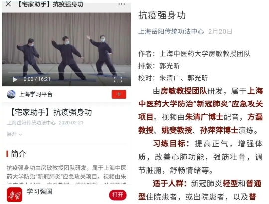 2020年疫情以来,房敏教授带领团队制定并推广“抗疫强身功”、“强心肺式八段锦”等,在方舱医院广泛应用,疗效显著,经“学习强国”等20余家平台传播,逾200万人受益,并被WHO收录入国际抗疫诊疗指南。相关成果荣获中国医院协会医院科技创新奖二等奖、上海康复医学科技奖(康复科普类)一等奖、上海市康复医学会抗击疫情康复作品奖等。