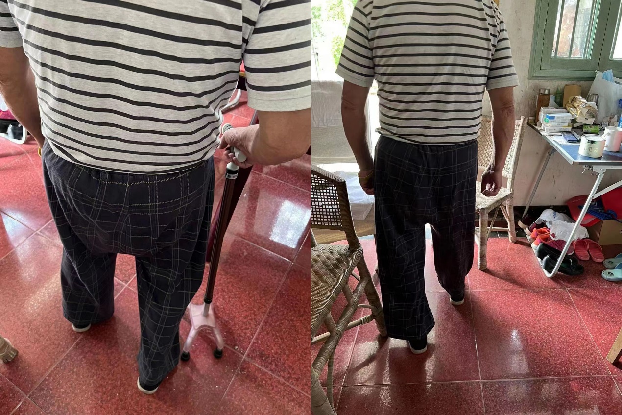 一个月远程指导后,严爷爷已经可以借助拐杖在家内安全行走,并独立完成进食、洗漱、穿衣、如厕等活动,生活能力与质量都有了明显提高,焦虑症状也得到了有效缓解。他感慨:“我从没想过有一天居然还能在家里康复,感谢你们让我重新走起来,之后我也会继续努力锻炼,争取早日生活自理。”严爷爷的女儿严阿姨表示,“我形影不离照顾爸爸两个月,但其实不懂要怎么帮他训练,多亏了有你们,他的状态一天比一天好,真的太感激你们了。”