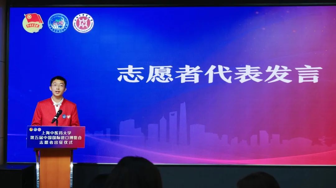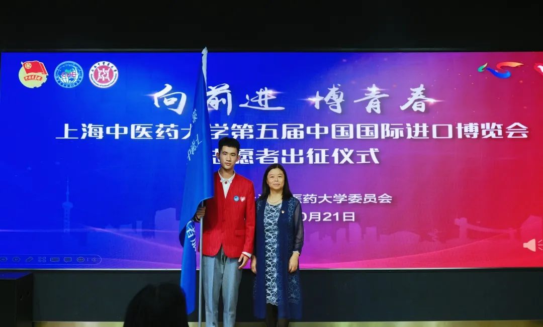 第五届中国国际进口博览会开幕在即,上中医“小叶子”5.0再次集结,准备出征!10月21日,bat365中文官方网站第五届中国国际进口博览会志愿者出征仪式在学校大学生创新创业实践园举行。今年是学校连续第五年派出“小叶子”们参与进博会的志愿服务,他们已蓄势待发、集结完毕,将以热情的服务、自信的面貌、向上的姿态,服务进博,展示上中医青年的青春风采。校党委副书记、副校长朱惠蓉,党委校长办公室、学工部(研工部)、保卫处、后勤保障处、宣传部(党委教师工作部),以及相关学院负责人等出席活动。