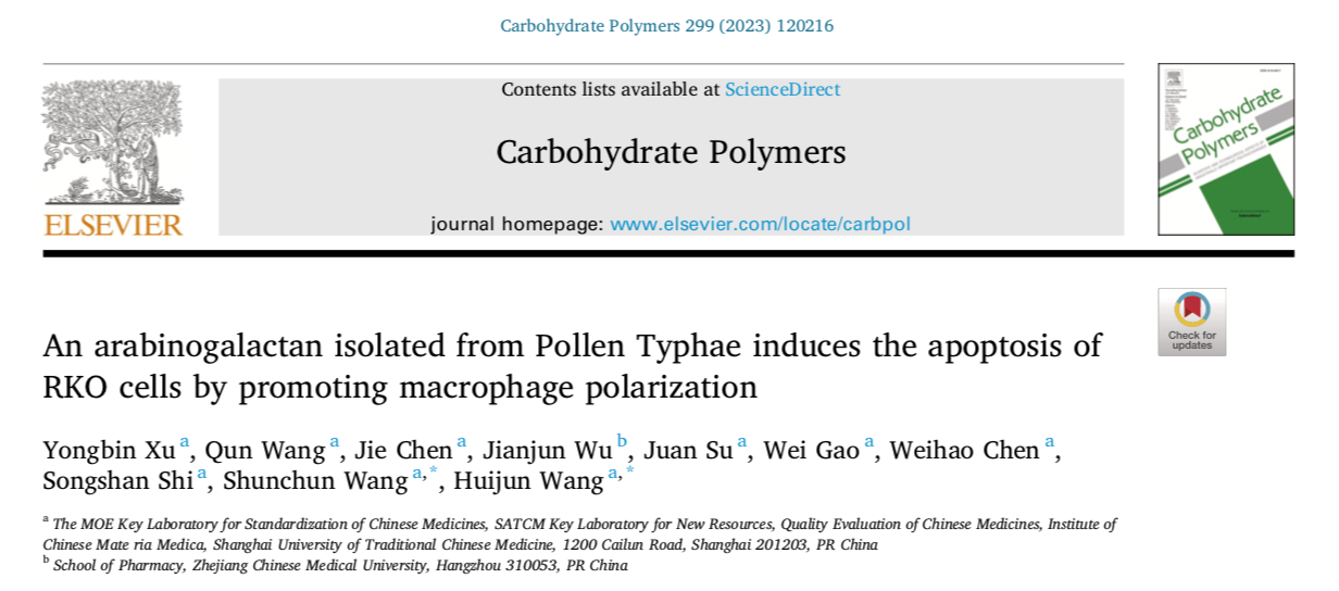 近日,中药研究所王顺春研究员团队在化学一区TOP期刊Carbohydrate Polymers发表揭示中药蒲黄中阿拉伯半乳聚糖在肿瘤免疫方面的最新研究成果An arabinogalactan isolated from Pollen Typhae induces the apoptosis of RKO cells by promoting macrophage polarization,该论文从中药蒲黄中提取得到一种新的阿拉伯半乳聚糖,并对其通过免疫调节抗肿瘤的作用机制进行研究。