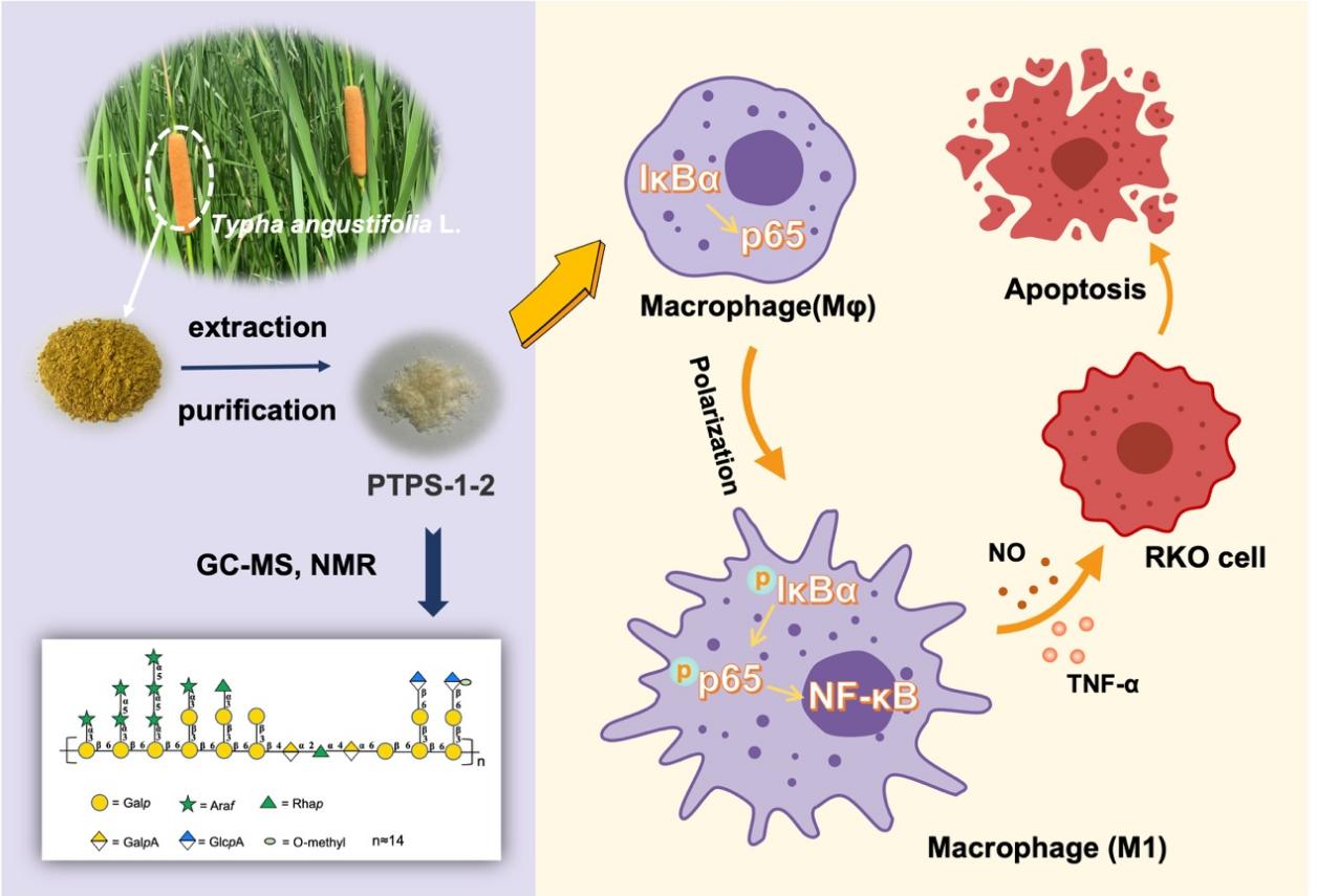 课题组长期致力于中药多糖的化学与生物效应研究。从中药蒲黄(香蒲科植物水烛香蒲Typha angustifoliaL.的干燥花粉)中分离鉴定出一种阿拉伯半乳聚糖(AG)PTPS-1-2,通过分子量测定、单糖组成分析、甲基化修饰、核磁分析对PTPS-1-2化学结构进行表征,PTPS-1-2为分子量59 kDa,并含有半乳糖醛酸与葡萄糖醛酸的AG-II型果胶多糖。其主链由-β-Galp-(6→1)-β-Galp-(6→、-β-Galp-(6→1)-β-Galp-(3→1)-β-Galp-(3→、-α-GalpA-(4→1)-α-Rhap-(2→1)-α-GalpA-(4→组成,并在1,3,6-Galp的3位连有支链1,5-α-Araf、T-α-Araf、T-α-Rhap、T-β-GlcpA、T-β-4-OMe-GlcpA。该研究通过调节肿瘤相关巨噬细胞的极化来研究PTPS-1-2对结肠癌RKO细胞的抗肿瘤作用及机制。结果显示,PTPS-1-2通过激活NF-κB信号通路极化M1型巨噬细胞。此外,还发现用PTPS-1-2预处理巨噬细胞的条件培养基(CM)可以通过抑制RKO细胞增殖和抑制细胞集落形成而发挥抗肿瘤作用。本研究不仅为AG的免疫调节活性和机制研究提供重要思路,还可启发和推动中药多糖在肿瘤免疫方面的应用。