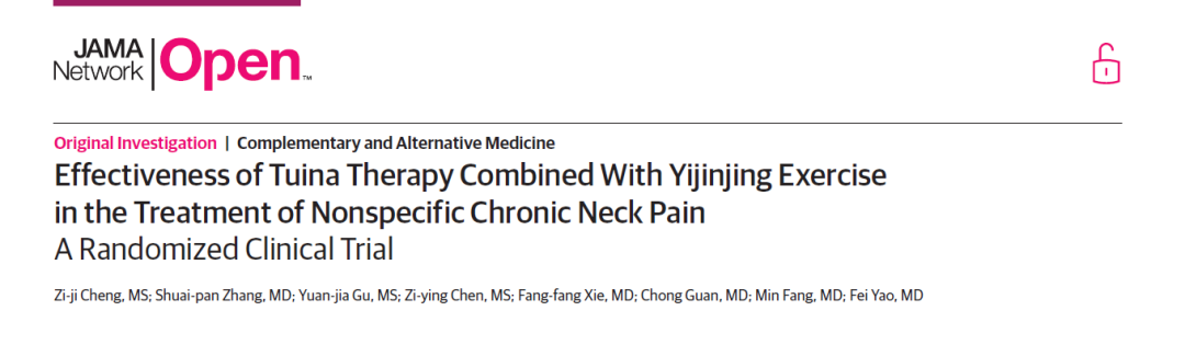bat365官网房敏和姚斐教授课题组中医推拿疗法干预慢性非特异性颈痛的临床研究项目成果Effectiveness of Tuina Therapy Combined With Yijinjing Exercise in the Treatment of Nonspecific Chronic Neck Pain: A Randomized Clinical Trial近日在美国医学会杂志JAMA子刊JAMA Network Open发表。
