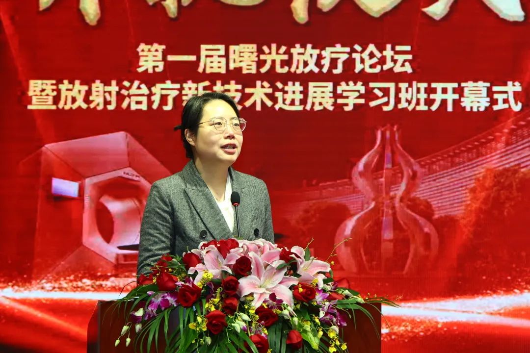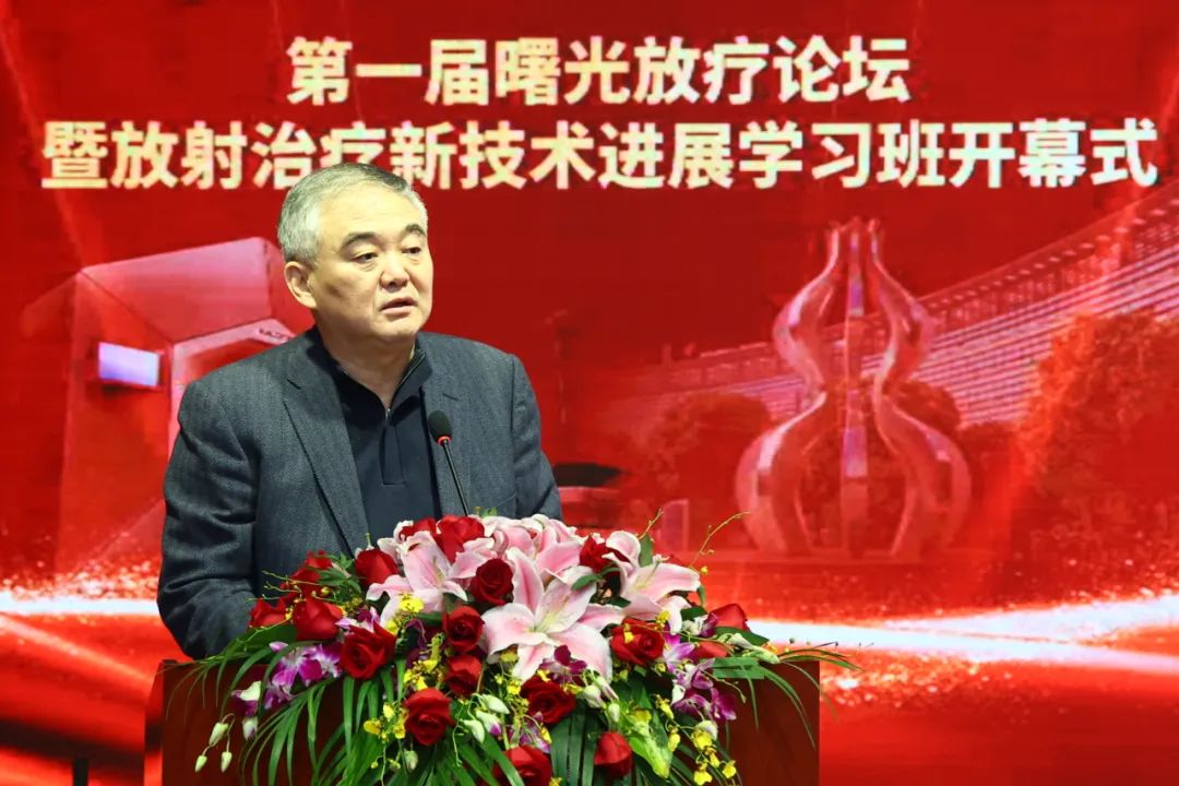 医院党委副书记、院长房敏致欢迎辞。他提到,经过两年的筹建,曙光医院放疗科克服重重困难顺利开科,是医院秉承“大医德泽,生命曙光”,致力于“中西合璧、精中通西”的新医疗模式下的实践成果。他相信曙光医院放疗科将团结奋进,用精湛的医术服务于病患,开启新的征程。
