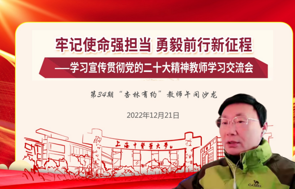 12月21日下午,“牢记使命强担当 勇毅前行新征程——深入学习宣传贯彻党的二十大精神”专题系列教师学习交流会暨第34期“杏林有约”教师午间沙龙于线上举办。全国模范教师、上海市教学名师、bat365官网终身教授方肇勤围绕党的二十大报告关于教育工作的关键词,以“立德树人忆初心培根铸魂育新人”为主题,与参会教师开展交流座谈。宣传部(党委教师工作部)副部长刘虹主持会议。教师党支部书记、青年教师班主任等70余位教师在线参与。