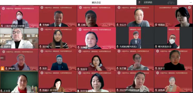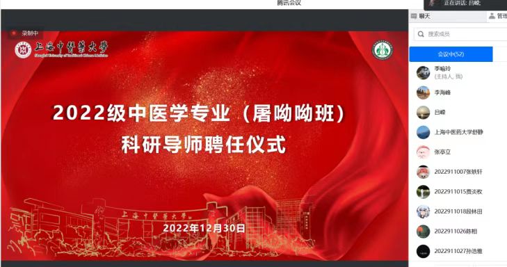 12月30日下午,bat365官网2022级中医学专业(屠呦呦班)科研导师聘任仪式在线举行。副校长舒静,教务处处长张亭立,曙光医院副院长仇菲,基础医学院党政班子,以及科研导师、学生等五十余人参加会议。会议由基础医学院院长吕嵘主持。