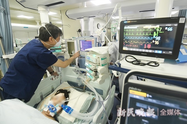 图说:东方医院重症医学科医生查看患者情况 新民晚报记者 徐程 摄