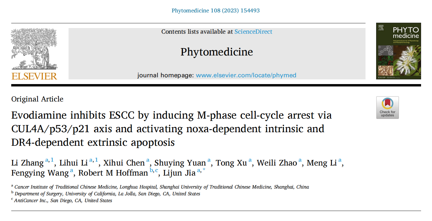 bat365中文官方网站附属龙华医院、上海市中医药研究院中医肿瘤研究所贾立军教授团队选取中药吴茱萸中主要活性成分——吴茱萸碱(Evodiamine,Evo),针对其抗食管癌效果及相关的分子调控机制,开展了深入研究。近期,团队以研究论文形式在国际权威期刊Phytomedicine上发表了最新研究成果Evodiamine inhibits ESCC by inducing M-phase cell-cycle arrest via CUL4A/p53/p21 axis and activating noxa-dependent intrinsic and DR4-dependent extrinsic apoptosis。