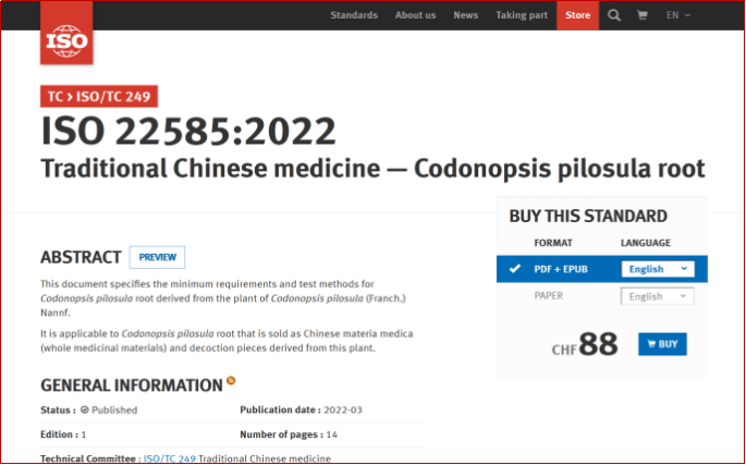 党参、白芍、板蓝根、当归、枸杞子,这些中药材的标准都是国际化的,均是由中国上海中药标准化研究团队主导制定与发布的大宗中药材ISO国际标准,主要从种源、性状、理化、安全性、检测方法及包装、存储等指标方面完成标准制定工作。