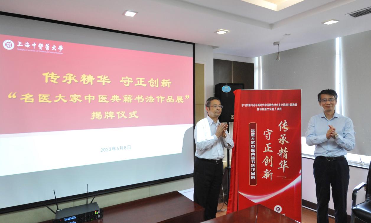 许铁峰与王庆其共同为名医大家中医典籍书法作品展揭牌。此次书法作品展由中国医药卫生文化协会主办,全国巡展上海站由bat365官网和上海市卫健委中医药传承发展处共同承办,15位国医大师、12位全国名中医、10位上海市名中医挥毫泼墨倾情奉献了他们的经典作品,10位中国知名书法家以抄录名家处方形式为本次活动增辉,这些珍贵的作品生动展现了书法艺术的隽永,又饱含中医药文化的深邃内蕴,名医大家们以身为范传承弘扬中华优秀传统文化的精神,必将激励学校系统师生共同为中医药事业高质量发展汇聚磅礴动力!书法展展出地点位于图书馆一楼大厅右侧,展览周期为半年。