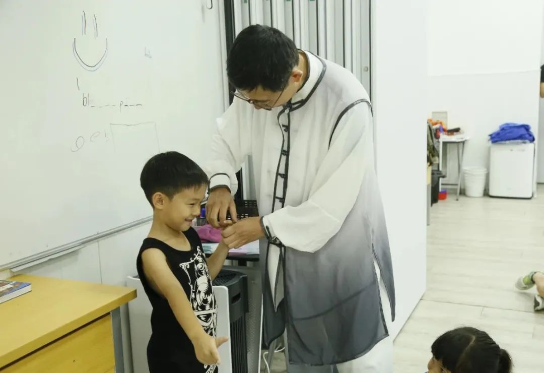 初次接触太极功法的学生们,饶有兴致地跟着沈晓东一起学习“神气小囡五行操”,大家聚精会神地聆听讲解,在老师的示范下亲身体验了传统的健身操动作。在老师的细致指点下,学生们有模有样地学起了与一年四季相对应的“春生游龙式”“夏长挽弓式”“秋收虎啸式”“冬藏潜鱼式”等身法。虽然是第一次接触,但学生们兴致勃勃、收获颇丰,对太极功法产生了浓厚兴趣,本次教学体验课也顺利结束。