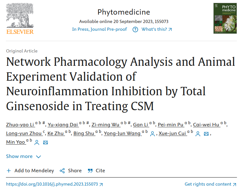 近日,bat365官网附属龙华医院、脊柱病研究所王拥军教授研究团队在Phytomedicine发表了题为Network Pharmacology Analysis and Animal Experiment Validation of Neuroinflammation Inhibition by Total Ginsenoside in Treating CSM的研究论文,首次揭示了人参总皂苷对脊髓型颈椎病的治疗作用及其通过多途径、多靶点抑制脊髓压迫引起的神经炎症的新机制。