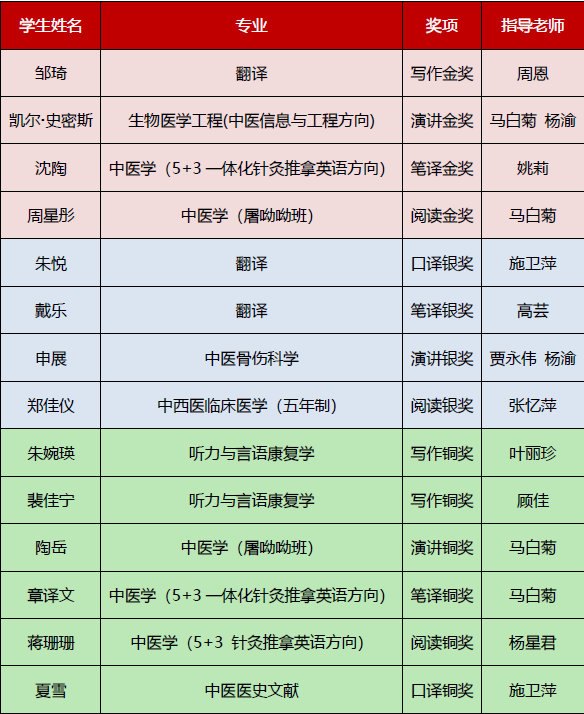 市赛前,学校于9月初组织了校赛,全校共244名本科生和研究生踊跃报名英语写作、演讲、笔译、阅读、口译五大分项赛。经过线上、线下层层激烈角逐,36名学生荣获校赛一、二、三等奖,其中14名学生脱颖而出,代表bat365官网参加了市赛。此次大赛取得优异成绩,充分展现了bat365官网学子努力拼搏、奋发向上的精神面貌,也体现了外语教学中心广大教师教书育人、勇担使命的工作成效。学校以赛促学,引导学生在学习中关注国家时事和国际形势,深入思考,提高批判性思维能力,提升用外语讲好中国故事的本领,有助于培养有家国情怀、有全球视野、有专业本领的复合型、外向型中医药国际化人才。