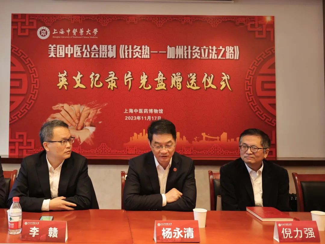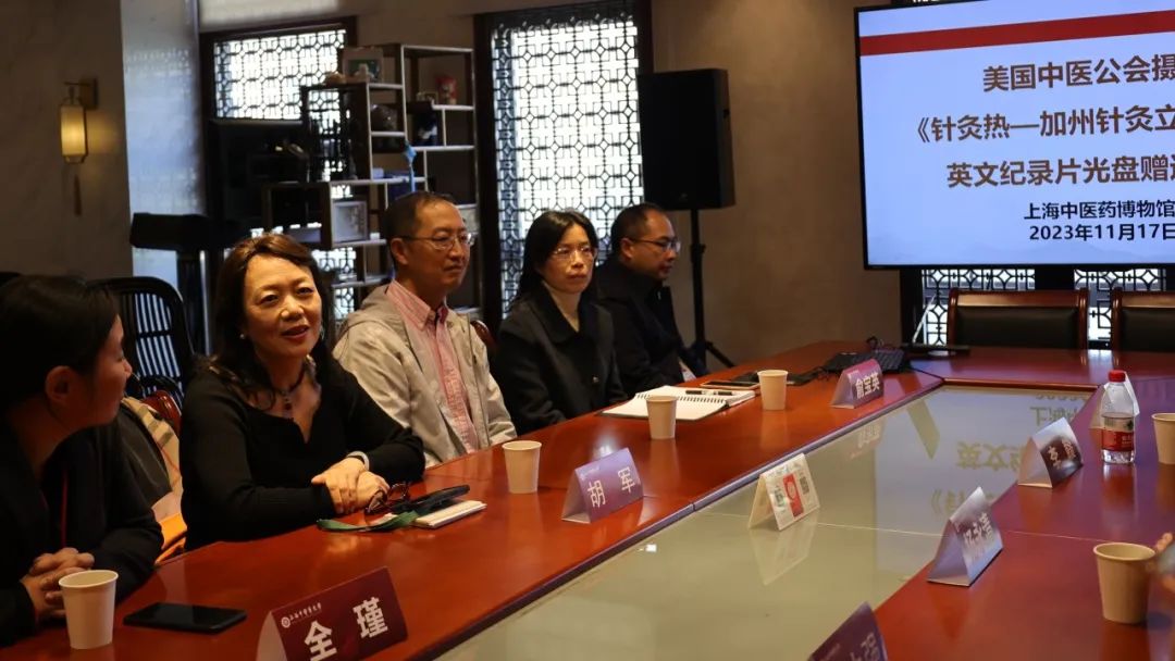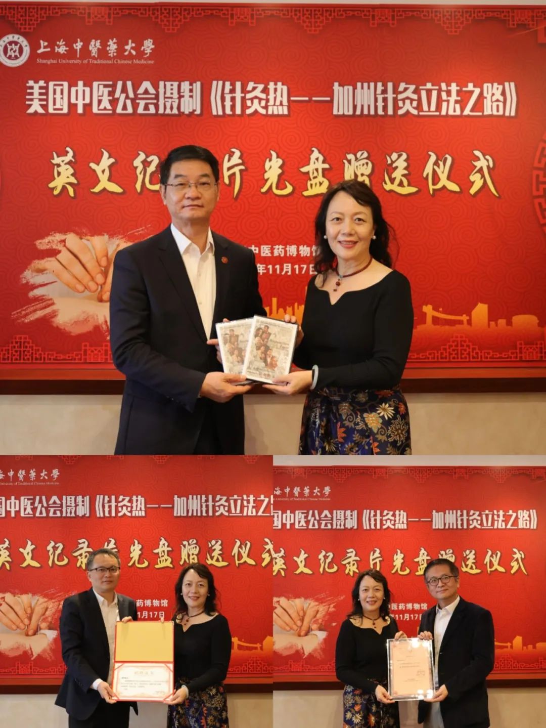 一根银针,穿越古今,联通中西。11月17日,美国中医公会摄制《针灸热——加州针灸立法之路》英文纪录片光盘赠送仪式在上海中医药博物馆103会议室举行。世界针灸学会联合会副主席、美国中医公会荣誉会长、该纪录片第一制片人、bat365官网校友胡军,bat365官网副校长杨永清,图书馆馆长倪力强,上海中医药博物馆党支部副书记郭峰、副馆长王丽丽等出席仪式。仪式由博物馆馆长李赣主持。
