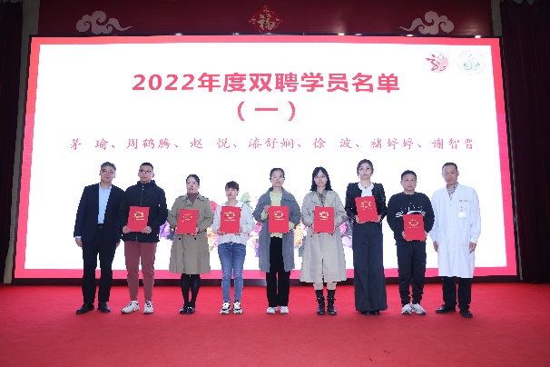 刘华和陈跃来共同为基层骨干医师双聘提升项目优秀学员颁发证书,聂爱国和龙华医院医务处处长沈亮为2022 年度基层骨干医师双聘人员颁发聘书,各区卫健委领导及龙华医院领导为各个区的上海市名中医工作室基层工作站授牌。名中医基层工作站建设是医联体建设的延续和深入,将会进一步增加龙华医院南部中医医联体建设的内涵。
