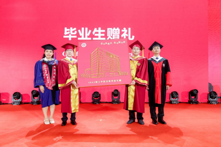 随后,毕业生代表将寄托着感恩之情的钉子画作品《勇做杏林小小螺丝钉》赠予母校。这幅画由2023届毕业生手工制作,用钉子和线勾勒出学校图书馆的建筑轮廓,以此纪念在母校遨游书海、相伴成长的奋斗时光。