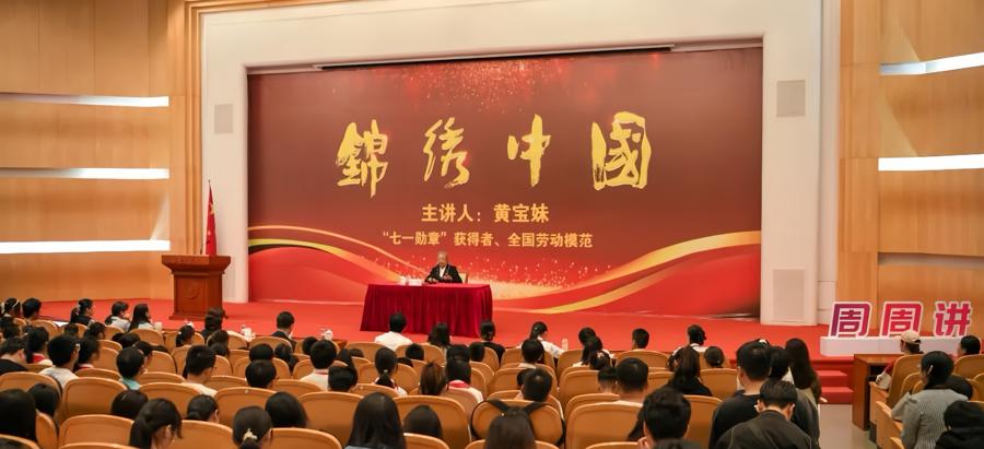 “七一勋章”获得者、全国劳动模范、东华大学校友黄宝妹走上《锦绣中国》讲台。