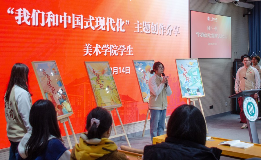 3月14日下午,上海师范大学美术学院苏盈荧等4名学生向选课同学讲解自己的4幅原创海报作品“衣食住行”,其中就有中国高铁里程数、国产大飞机投入商飞、新能源电动车出海等“新三样”画面。