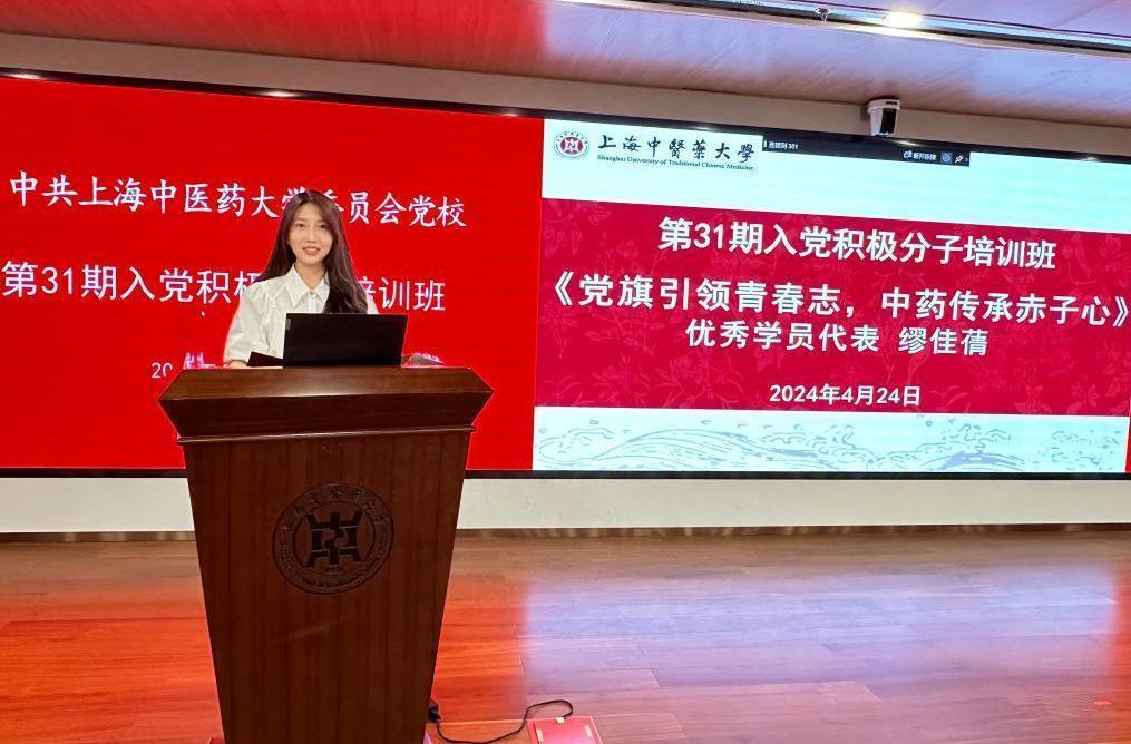 交叉科学研究院缪佳蒨作为学员代表发表学习感言。她以“党旗引领青春志,中药传承赤子心”为题,分享了自己在培训过程中的心得体会。她表示,培训虽然结束,但学习和成长的脚步将永不停歇。在未来的学习和工作中,她将把所学所悟转化为实际行动,不断加强自我提升,勇攀高峰,为传承创新发展中医药事业贡献力量,并努力早日成为一名合格的中国共产党员。