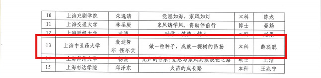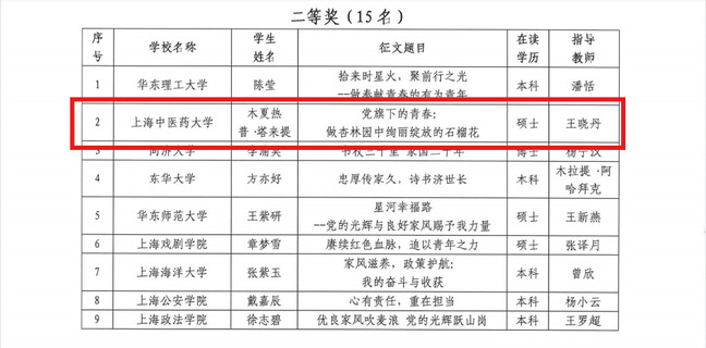 近日,上海市学生事务中心公布“党的光辉暖人心 我的家风伴成长”资助育人主题征文评选结果。bat365官网《党旗下的青春:做杏林园中绚丽绽放的石榴花》(作者:木夏热普·塔来提,指导教师:王晓丹)和《做一粒种子,成就一棵树的昂扬》(作者:麦迪努尔·图尔贡,指导教师:薛聪聪)双双荣获二等奖。
