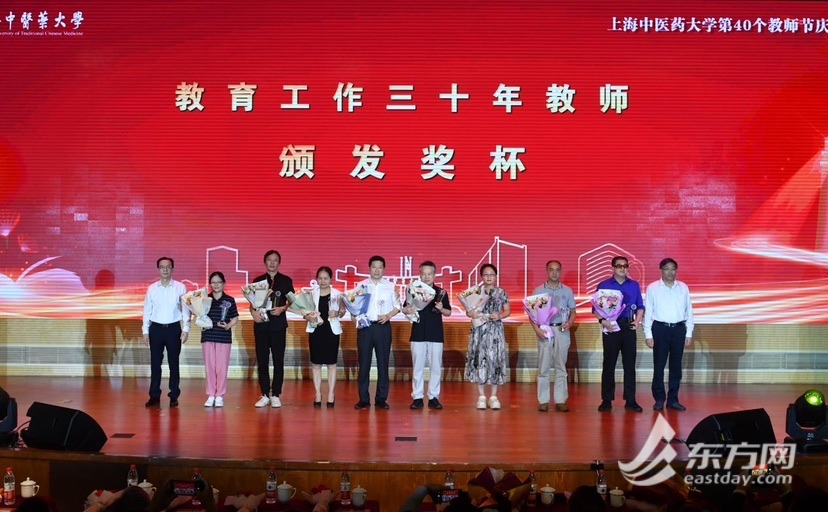 大会上,校党委书记曹锡康、校长季光为从教三十年的教师代表颁授纪念奖杯,感谢他们“马不扬鞭自奋蹄”的敬业态度和“不计名利无私付出”的奉献精神。
