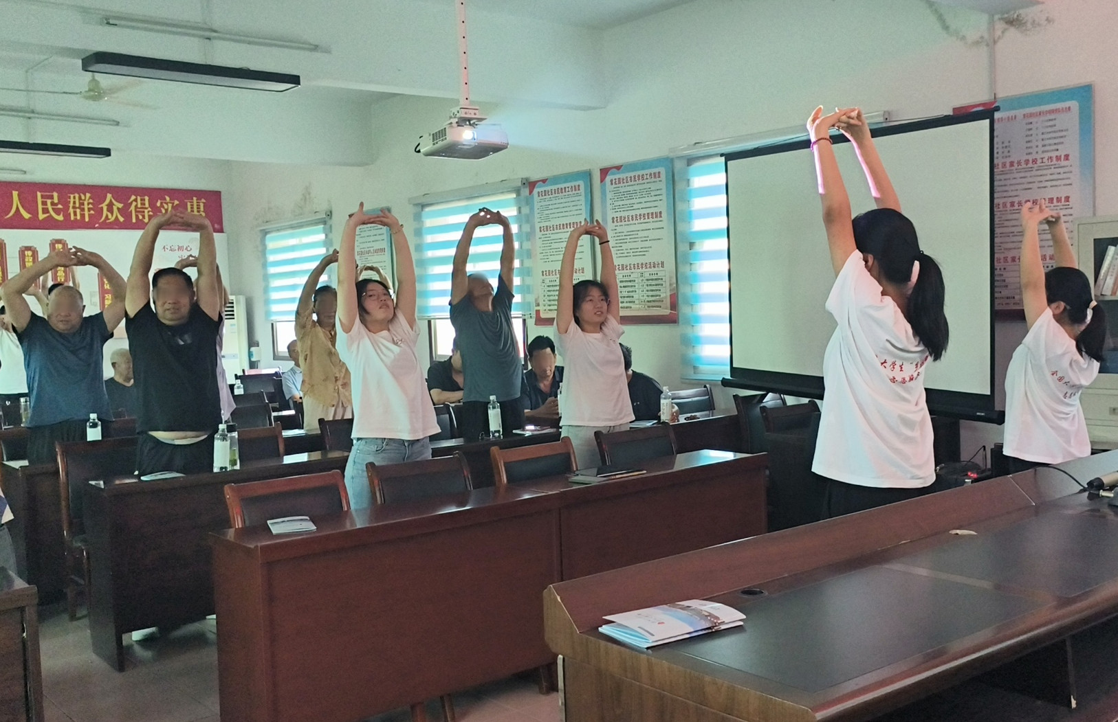 为提高基层群众对中医药的认识,团队成员积极发挥自身专业优势,走进常花园社区等基层村镇,为当地居民与中老年人开展中医养生、八段锦等多个主题的中医药知识讲座。团队成员们用生动的故事和图文并茂的介绍,让大家领略到中医药在日常生活中的智慧运用,感受到中医药文化的博大精深。最后,带练八段锦更是带动了在场居民一起练习。这一系列讲座不仅为居民们带来了知识的启迪,更激发大家对中医药文化的兴趣和热爱,为乡村群众带来新的养生方案。