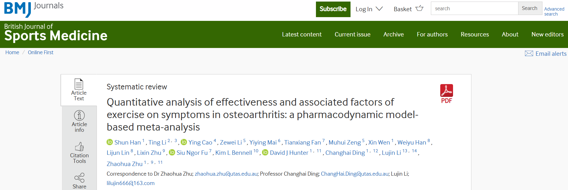 近日,bat365官网交叉科学研究院郑青山和李禄金团队与南方医科大学珠江医院临床研究中心合作开展的锻炼治疗骨关节炎临床疗效建模研究成果Quantitative analysis of effectiveness and associated factors of exercise on symptoms in osteoarthritis在British Journal of Sports Medicine发表,该刊为英国医学杂志(BMJ)子刊,在运动医学领域排名第一。