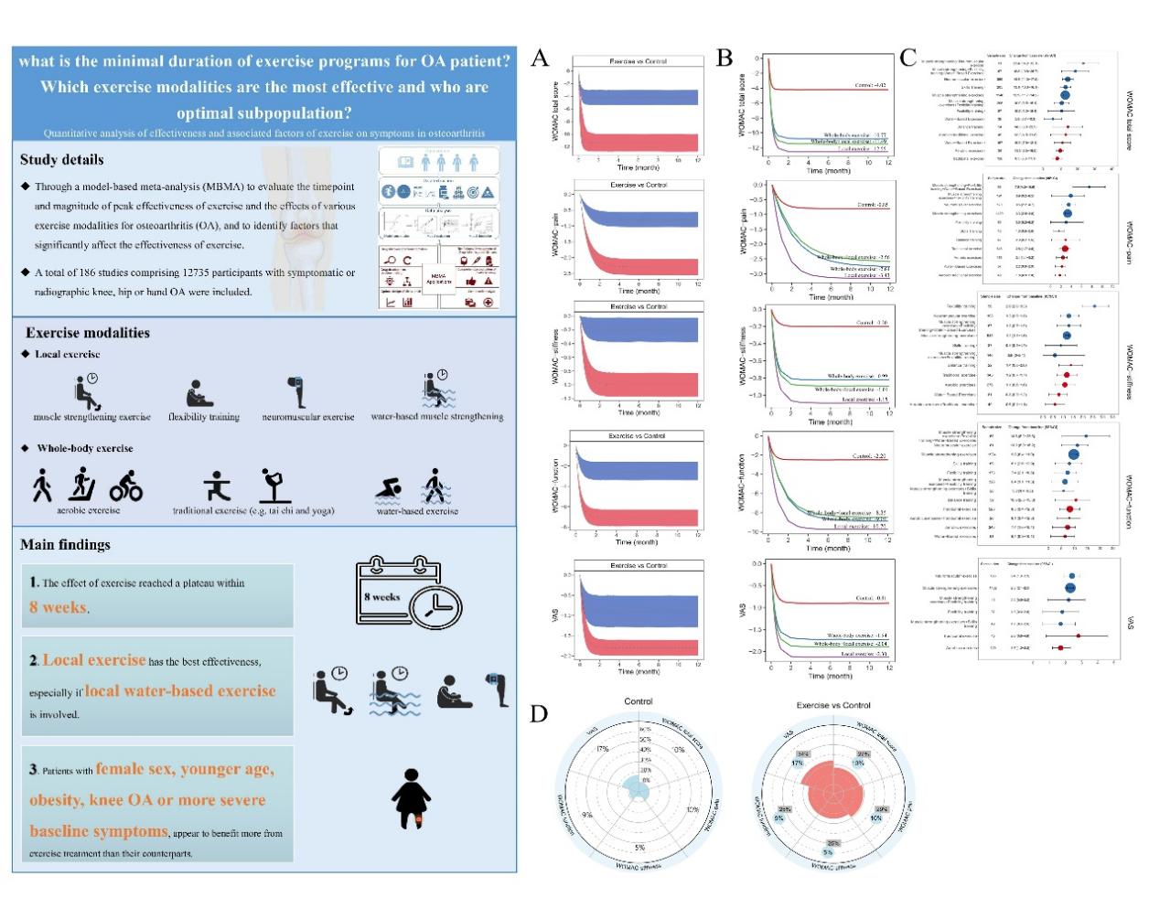 骨关节炎(OA)是最常见的关节炎类型,同时也是导致慢性关节疼痛和残疾的主要原因。随着全球老龄化和肥胖率的不断增加,OA疾病负担也在迅速增加,现已成为一个严重的公共卫生问题。锻炼作为一种经济且有效的治疗手段,能够提升肌肉力量、增加关节活动范围以及改善身体功能,从而缓解OA的症状。多数临床指南中强烈推荐将锻炼视为OA患者的核心治疗方式。现有的研究表明,不同的锻炼处方(例如锻炼类型、强度和治疗持续时间)以及患者的亚组特征可能影响治疗效果。然而,锻炼治疗的最佳处方和目标患者亚组尚未明确。因此,定量评估最佳的锻炼处方及其适用的亚人群对于优化当前针对OA的锻炼治疗建议具有重要意义。