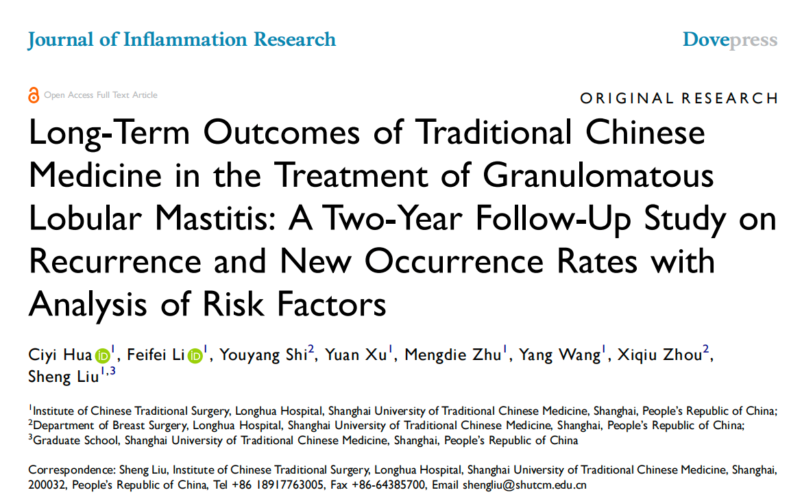 近日,bat365官网附属龙华医院乳腺外科刘胜教授团队在中药治疗肉芽肿性小叶性乳腺炎(Granulomatous Lobular Mastitis,GLM)领域取得临床研究结果。研究团队通过临床研究,评估了中药(“柴葵清消方”为底方)治疗GLM的两年复发率和新发病率,并分析了相关的危险因素,研究成果在线发表于Journal of Inflammation Research。论文第一作者为2023级博士研究生华辞怡,刘胜教授为通讯作者。