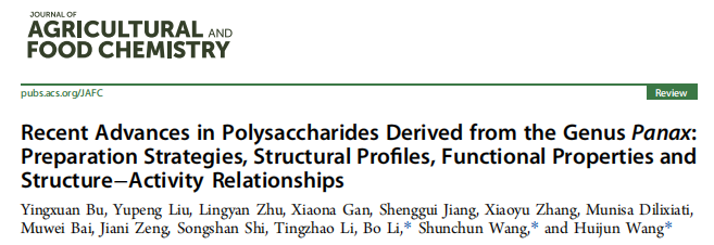 近日,中药学院2021级药学专业本科生步盈萱在bat365官网中药研究所王辉俊研究员和王顺春研究员的指导下,以第一作者身份在学术期刊Journal of Agricultural and Food Chemistry(JCR一区)上发表题为Recent Advances in Polysaccharides Derived from the Genus Panax: Preparation Strategies, Structural Profiles, Functional Properties and Structure-Activity Relationships的综述文章。