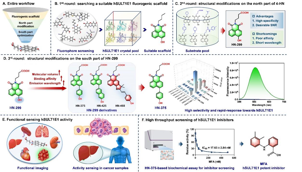 该研究采用基于目标酶3D结构的理性分子设计策略,通过三轮虚拟筛选和结构优化,成功研发了首个具有亚型特异性和良好光学响应特性的hSULT1E1荧光底物HN-375。团队借助HN-375构建了基于荧光的SULT1E1酶活检测方法,并将其成功用于肝组织制备物、肝癌组织和器官等复杂生物系统中hSULT1E1活性的检测。该方法还被用于hSULT1E1抑制剂的高通量筛选和表征,并从天然产物库和老药库中成功发现了两种强效hSULT1E1抑制剂(穗花杉双黄酮和甲酚那酸)。该研究为设计研发亚型特异性酶激活型光学底物提供了实用的底物设计策略,研发的hSULT1E1特异性荧光底物有望极大地推动hSULT1E1相关疾病的基础研究和靶向hSULT1E1的药物开发进程。