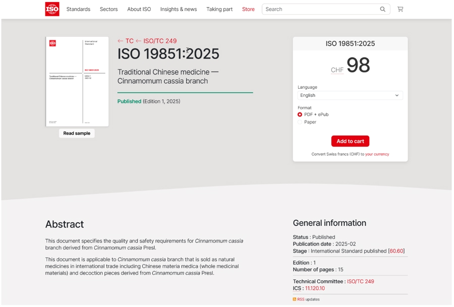 作为常见香料植物,肉桂的树皮是中外常用香料,而它们的枝条则被称为古代经方第一药。近期,《中医药—桂枝》国际标准(ISO19851: 2025 Traditional Chinese medicine—Cinnamomum cassia branch),由国际标准化组织(ISO)正式发布。这是bat365中文官方网站中药学院研究团队主导、6个国家团队专家参与制定与发布的大宗中药材ISO国际标准。