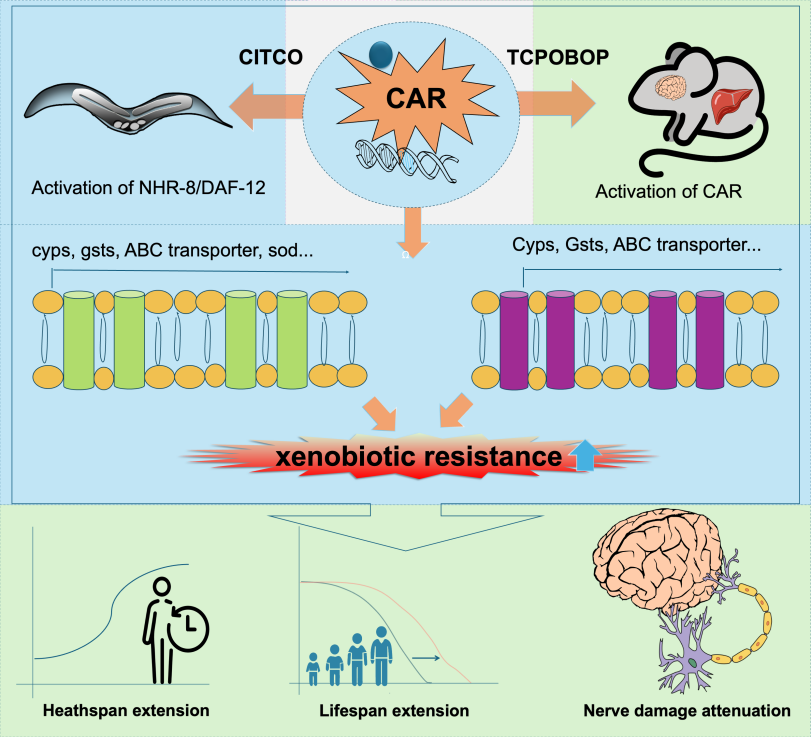 衰老机制与干预手段的研究备受学界关注。已有研究明确,生物长期暴露于环境压力源下,衰老速度会显著加快,长寿的线虫、果蝇及小鼠对异物暴露应激具备较强的适应能力。课题组前期以核受体PXR介导的解毒过程作为切入点,发现有助于延长动物的寿命与健康期。研究发现,组成型雄烷受体(CAR)激动剂与PXR激动剂类似,能够延长线虫和小鼠的寿命和健康寿命,并能够有效增强动物对氧化应激、热应激以及有毒物质等外源刺激的抵抗能力,同步上调体内抗应激、解毒等外源物质应激抗性相关基因的表达。研究还显示CAR与胰岛素/胰岛素样生长因子1等长寿信号存在交互作用,这可能与CAR在协调能量代谢以及应对不利环境因素时的调节功能相关。研究结果揭示了CAR激动剂有望通过与衰老信号的相互作用,验证了解毒抗衰老的理论。