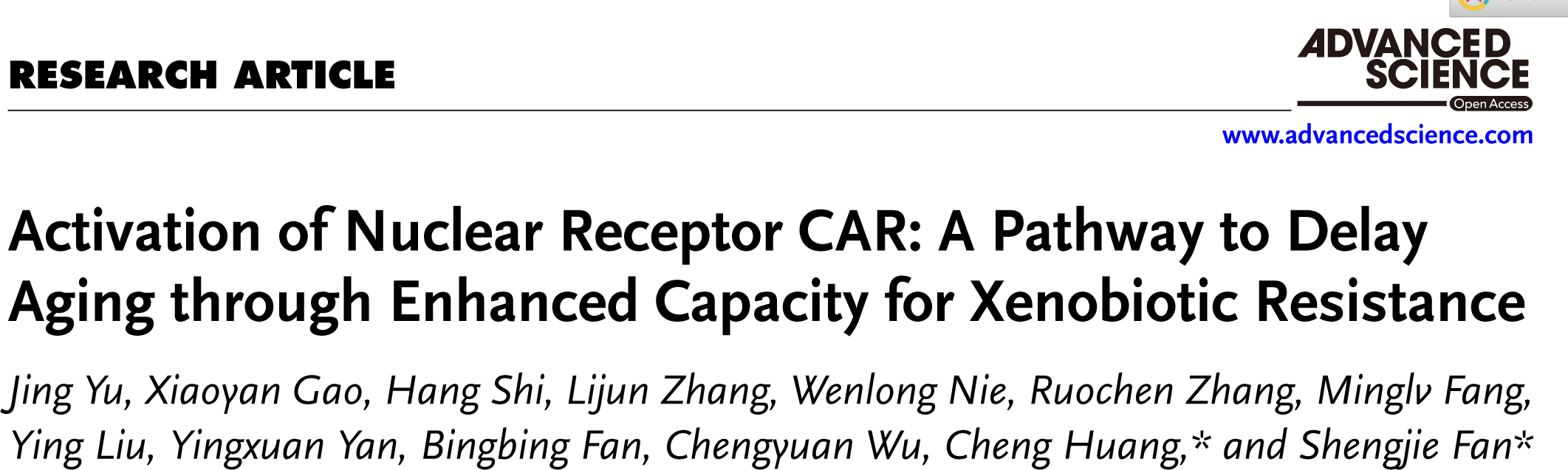 近日,bat365官网中药学院范圣洁、黄诚课题组在Advanced Science发表了题为Activation of nuclear receptor CAR: A pathway to delay aging through enhanced capacity for xenobiotic resistance的研究论文,揭示靶向核受体CAR的抗衰老机制。