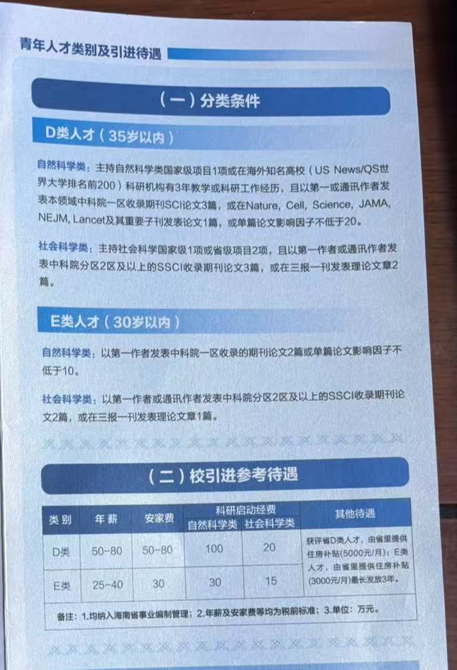 澎湃新闻记者在现场了解到,海南医科大学的人才引进参考待遇为D、E两类。E类人才首年待遇可高达100万元,要求应聘者需获得博士学位,自然科学类以第一作者发表期刊论文两篇或单篇影响因子不低于10,社会科学类以第一作者发表论文2篇或发表理论文章1篇。D类人才待遇更高,对工作经验和成果也有一定的要求。