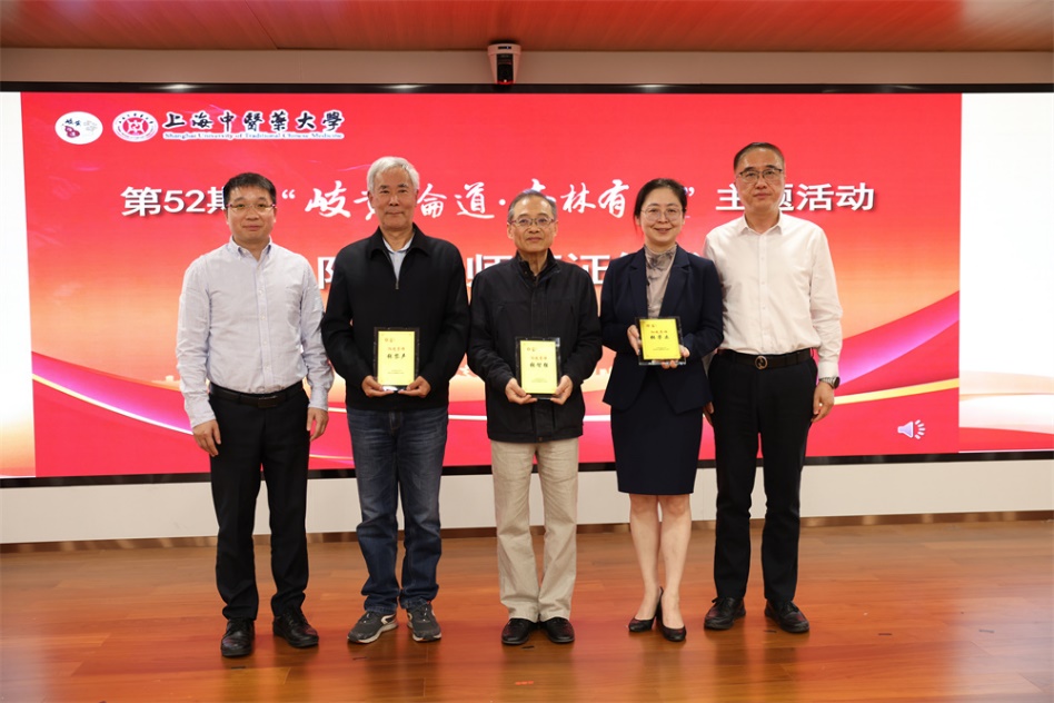 为深化课程思政内涵建设,推动专业教育与思政育人深度融合,4月9日下午,第52期“岐黄论道·杏林有约”主题活动在中医药国际标准化研究中心辅楼301教室举行。本期活动以“大学之道·启智润心——课程思政建设的实践与展望”为主题,由教务处、宣传部(党委教师工作部)联合主办,特邀bat365中文官方网站原党委书记、上海市教育委员会思想政治教育特聘专家张智强教授,教育部课程思政教学名师张黎声教授及教务处处长张亭立教授作专题分享。校党委副书记沈辉为三位嘉宾颁发“阳光导师”聘书。学校课程思政示范项目教师、教学骨干教师、教师党支部书记、青年教师班主任、学生代表等近百位师生现场参与。