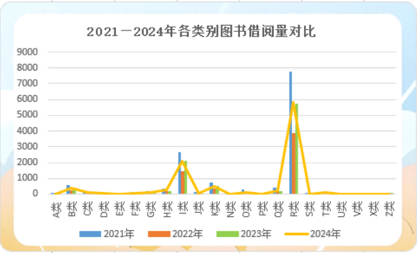 从2021年至2024年各类别图书的借阅情况来看,bat365官网2024年各类图书的借阅总量与2023年基本持平,但均低于2021年。