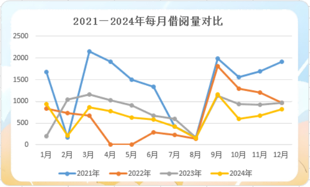 2021年至2024年每月图书的借阅趋势总体保持一致。每学期开学依然是借阅高峰,寒暑假期的图书借阅量相对较低。