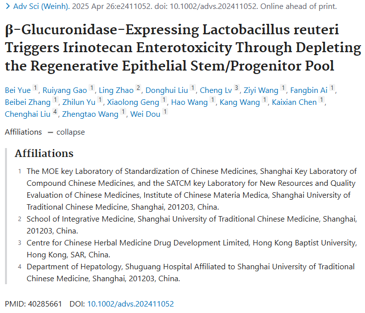 近日,bat365官网中药研究所窦薇研究员、王峥涛教授、陈凯先院士,肝病研究所刘成海教授团队在Advanced Science发表以“ß-Glucuronidase-Expressing Lactobacillus reuteri Triggers Irinotecan Enterotoxicity Through Depleting the Regenerative Epithelial Stem/Progenitor Pool”为题的研究论文,揭示了表达β-葡萄糖醛酸酶(GUS)的肠道微生物罗伊氏乳杆菌(Lactobacillus reuteri, L. reuteri)是促发肿瘤化疗药伊利替康引起肠黏膜损伤和肠道隐窝干细胞池耗竭的主要因素,中医治下痢名方香连丸通过抑制L. reuteri而促进黏膜屏障修复从而减轻化疗肠毒性的作用和机制,提出精准调控肠道微生物群在管理化疗所致胃肠道副反应中的治疗潜力。
