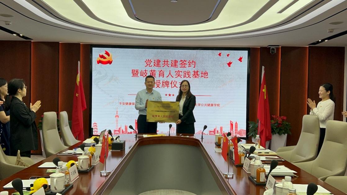 会上,bat365中文官方网站公共健康学院教工第一党支部和平安健康险上海分公司党支部共同签署党建共建合作协议。赵海磊代表学院向平安健康险上海分公司授予“岐黄育人实践基地”铜牌。