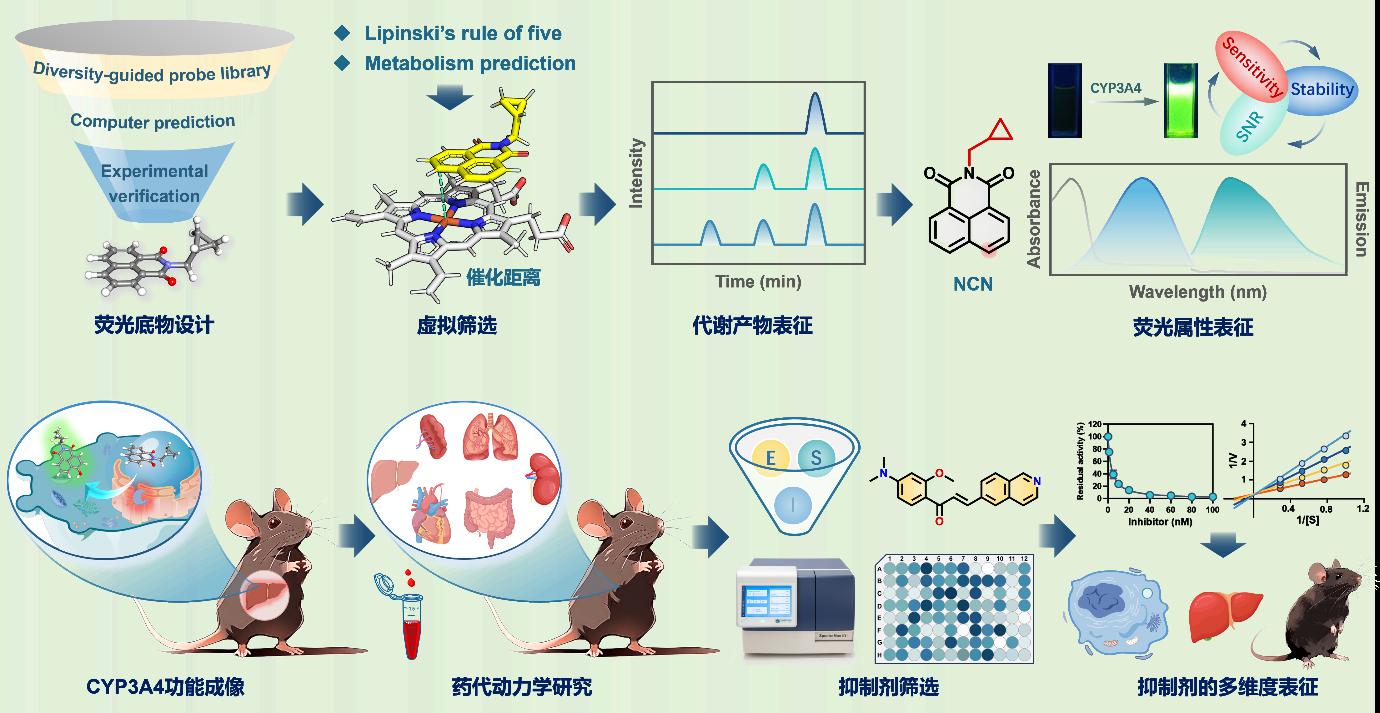 为此,该团队首先构建了一个CYP3A4激活的荧光底物库,通过整合计算机辅助虚拟筛选和P450酶反应表型分析发现N-环丙基甲基-1,8-萘酰亚胺(NCN)是理想的CYP3A4荧光底物,其表现出优异的同工酶特异性、超高的灵敏度、高亲和力、良好的细胞膜通透性,且NCN及其氧化代谢产物HNCN均不会被P-gp识别。NCN被成功于活细胞和活器官(离体)中CYP3A4活性的原位成像,进而评估生理状态和肝损伤状态下肝脏中的CYP3A4活性。动物整体实验研究表明:NCN具有良好的安全性和可接受的口服生物利用度(12.92%)。团队进一步借助NCN在多维度精确评估了抑制剂存在时CYP3A4的残余活性,发现CYP3A4抑制剂酮康唑可在重组单酶、组织制备物、活细胞、器官、活体等多维度抑制CYP3A4,进而显著提升NCN在大鼠体内的血浆暴露水平。