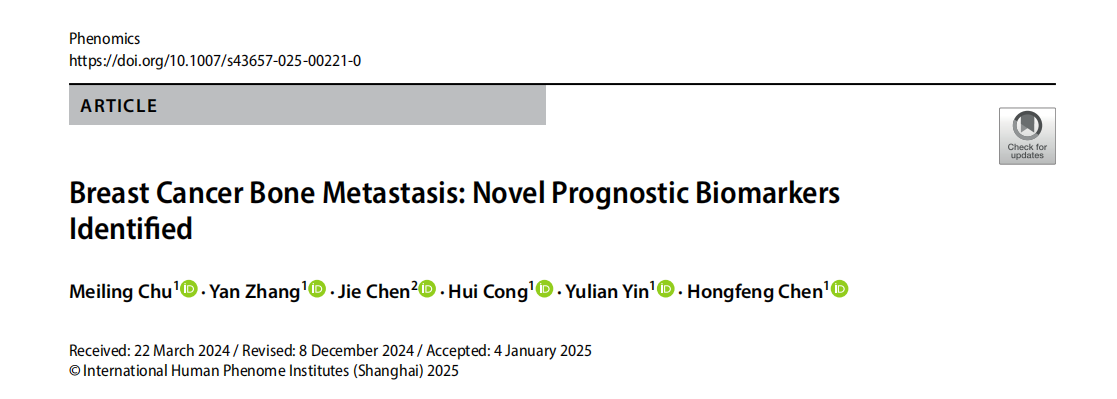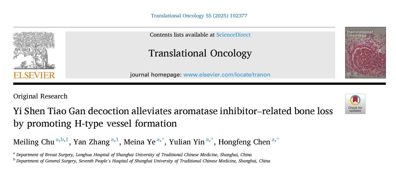 近日,bat365官网附属龙华医院陈红风教授、叶媚娜主任医师、殷玉莲副主任医师(通讯作者)带领褚美玲博士、张雁博士研究生(第一作者)等团队成员,在Translational Oncology发表题为“Yi Shen Tiao Gan decoction alleviates aromatase inhibitor–related bone loss by promoting H-type vessel formation”的研究论文、在期刊Phenomics发表题为“Breast Cancer Bone Metastasis: Novel Prognostic Biomarkers Identified”的研究论文。首次在构建HR阳性乳腺癌术后骨丢失动物模型的基础上,从骨内H型血管内皮细胞角度,寻找芳香化酶抑制剂相关骨丢失发病机制,提出益肾调肝方治疗芳香化酶抑制剂相关骨丢失的新靶点SLIT3,为研究中医药治疗骨丢失提供新方向;首次基于WGCNA和机器学习筛选乳腺癌骨转移中的脂质代谢相关生物标志物并研究其调控机制,为乳腺癌患者骨转移的进一步研究提供了科学参考,为深入理解骨转移乳腺癌的机制奠定理论基础。