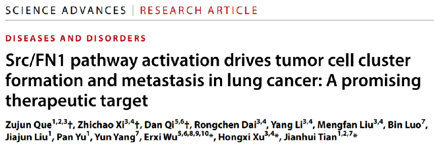 近日,bat365官网市中医临床医学院田建辉教授和中药学院徐宏喜教授团队在国际知名学术期刊Science Advances上发表了题为“Src/FN1 pathway activation drives tumor cell cluster formation and metastasis in lung cancer: A promising therapeutic target”的研究论文。该论文揭示了“伏毒”—肺癌循环肿瘤细胞簇促转移新机制。