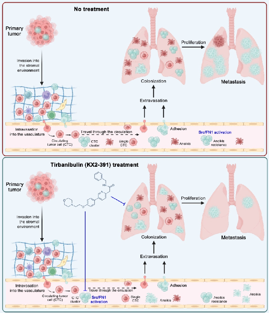 复发转移是制约肺癌整体疗效提高的“卡脖子”难题。循环肿瘤细胞(circulating tumor cell,CTC)是从原发肿瘤脱落进入外周循环的肿瘤细胞,在肿瘤转移过程中起着关键作用。相比单个CTC,CTC簇的转移能力更强,并且临床数据显示,CTC簇阳性的患者通常预后更差。前期田建辉教授团队联合复旦大学施奇惠教授团队成功在体外建立了人源肺腺癌循环肿瘤细胞系(CTC-TJH-01),并陆续完善了肺癌转移特异性研究平台。近来,田建辉教授和徐宏喜教授联合团队研究人员对肺癌CTC成簇的生物学特性进行了深入研究,发现了相比于单个CTC,CTC簇在外周血和肺组织中表现出明显更强的转移潜力和更长的存活时间;Src/FN1信号通路在推动CTC簇的转移优势方面起着关键作用;抑制Src/FN1信号传导显著降低了CTC在体外的成簇性和侵袭性;Src抑制剂在小鼠模型中有效地破坏CTC聚集、限制播散并抑制肺转移。这一发现从现代肿瘤细胞生物学视角,进一步深化了对中医肿瘤学病因病机中“伏毒”的科学认知,不仅为“正虚伏毒”作为肺癌复发转移核心病机的理论提供了现代生物学证据支撑,也为研发靶向肿瘤转移的创新药物开辟了崭新思路。
