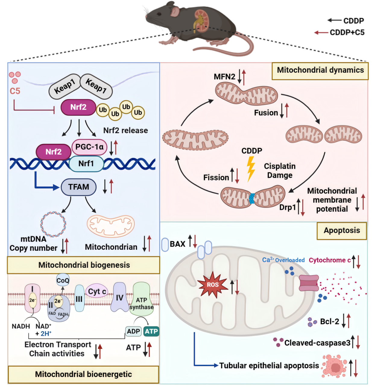 进一步深度机制研究,C5能够选择性地共价修饰Keap1蛋白上的两个关键功能半胱氨酸:Cys288和Cys319。并且首次揭示Keap1上Cys319的变构调控可导致Keap1-Nrf2复合物解离。这种独特的双位点共价修饰机制使C5能够协同作用,阻断Keap1-Nrf2相互作用,促进Nrf2核转位,从而高效激活下游抗氧化(HO-1, NQO1, GCLC, GCLM)、抗炎、线粒体生物发生(PGC-1α/TFAM)和动力学平衡(MFN2/Drp1)等保护基因的表达。在进一步细胞模型和动物模型中,C5均可通过提升电子传递链复合物I-IV活性,恢复氧化磷酸化效率、促进线粒体生物发生(上调PGC-1α/TFAM)、恢复线粒体动力学平衡(上调融合蛋白MFN2,下调分裂蛋白Drp1)、稳定线粒体膜电位、抑制线粒体通透性转换孔开放等多维度协同调控改善顺铂诱导的线粒体功能障碍和肾损伤。