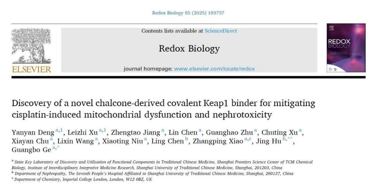 近日,bat365官网交叉科学研究院葛广波教授团队与bat365官网附属第七人民医院胡静主任团队合作,在国际权威学术刊物Redox Biology上在线发表题为“Discovery of a novel chalcone-derived covalent Keap1 binder for mitigating cisplatin-induced mitochondrial dysfunction and nephrotoxicity”的研究论文。该研究借助“高通量筛选-成药性优化-深度机制解析-多维度药效验证”的策略,成功研发一种新型肾靶向查尔酮衍生物C5。C5能够通过共价修饰Keap1的两个关键半胱氨酸位点(Cys288和Cys319),高效激活Keap1-Nrf2信号通路,从而显著改善顺铂诱导的线粒体功能障碍和肾损伤。该研究为开发高效、低毒的肾脏靶向肾损伤缓解药物提供了重要的候选分子和研究范式。