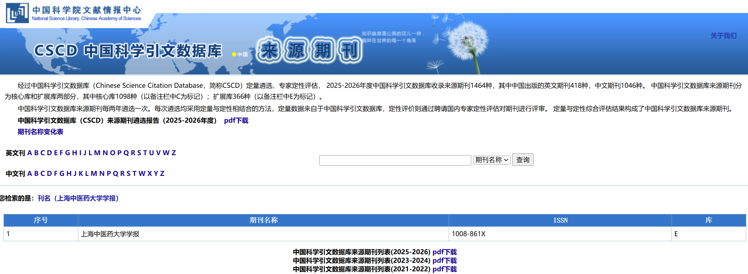 近日,中国科学院文献情报中心公布了2025-2026年度中国科学引文数据库(Chinese Science Citation Database,简称CSCD)来源期刊目录。