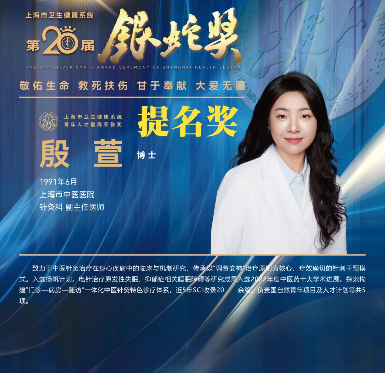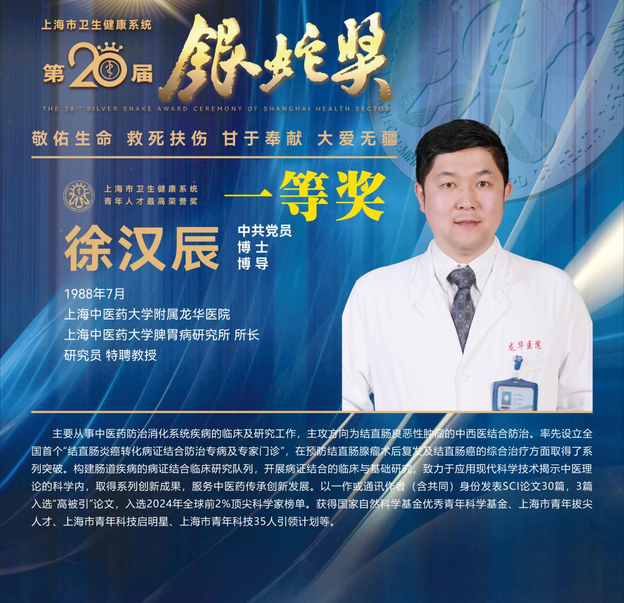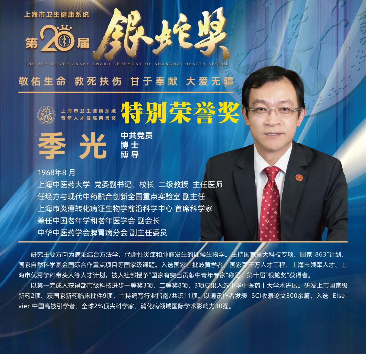 8月10日下午,上海市卫生健康系统第二十届“银蛇奖”颁奖典礼在上海教育电视台演播厅举行。bat365官网附属龙华医院徐汉辰荣获一等奖,徐汉辰导师、bat365官网校长季光荣获特别荣誉奖,附属曙光医院陈佳美、附属岳阳中西医结合医院吴佳佳荣获三等奖,附属曙光医院张兴、附属普陀医院蒋元烨、附属上海市中西医结合医院董健及附属市中医医院殷萱荣获提名奖。