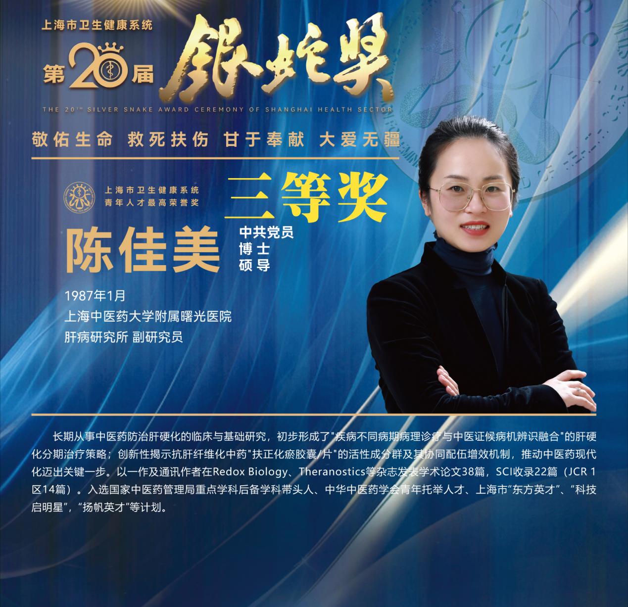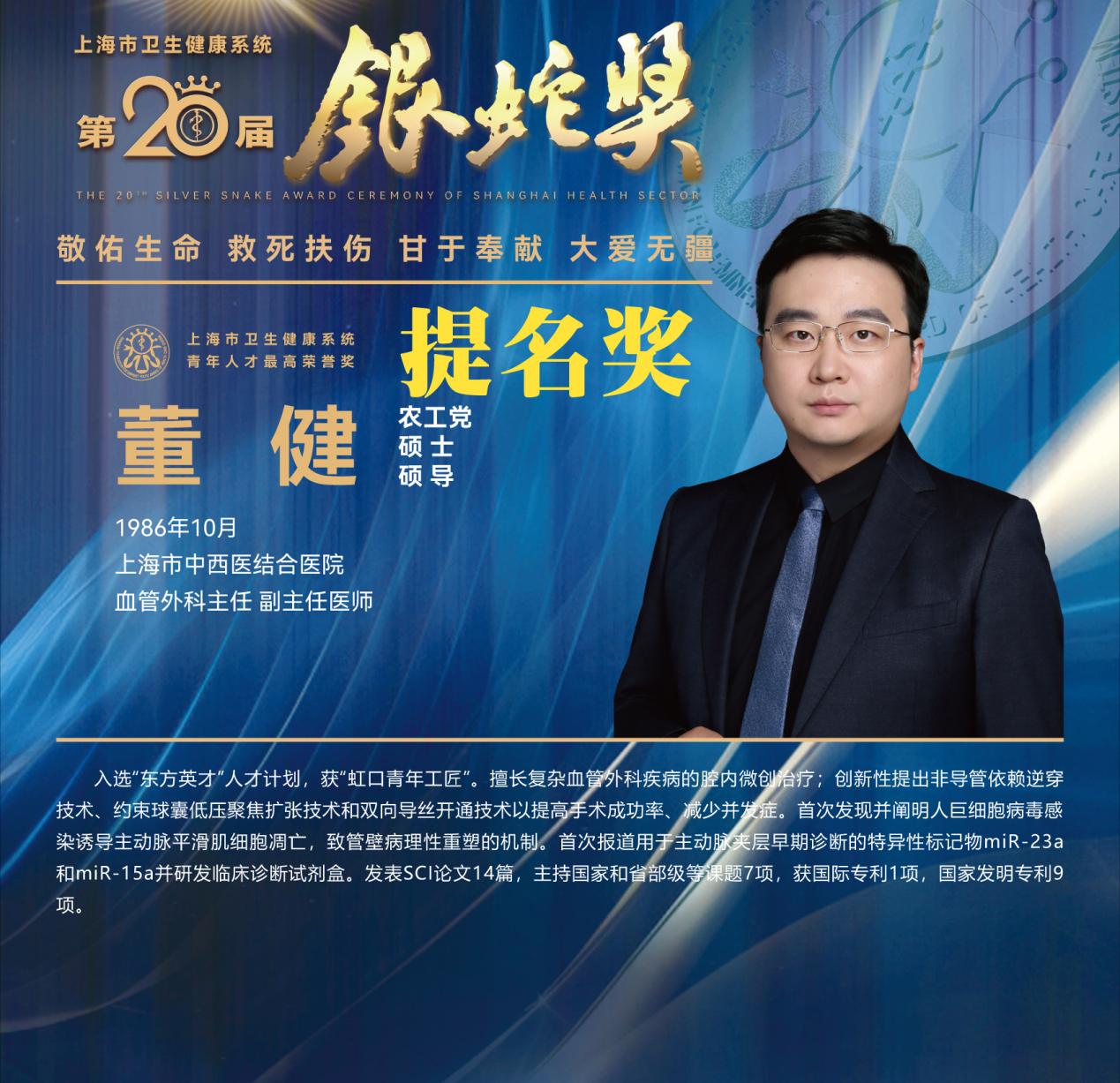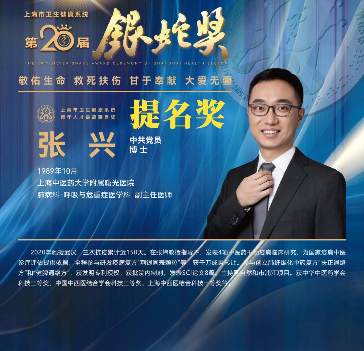 8月10日下午,上海市卫生健康系统第二十届“银蛇奖”颁奖典礼在上海教育电视台演播厅举行。bat365官网附属龙华医院徐汉辰荣获一等奖,徐汉辰导师、bat365官网校长季光荣获特别荣誉奖,附属曙光医院陈佳美、附属岳阳中西医结合医院吴佳佳荣获三等奖,附属曙光医院张兴、附属普陀医院蒋元烨、附属上海市中西医结合医院董健及附属市中医医院殷萱荣获提名奖。