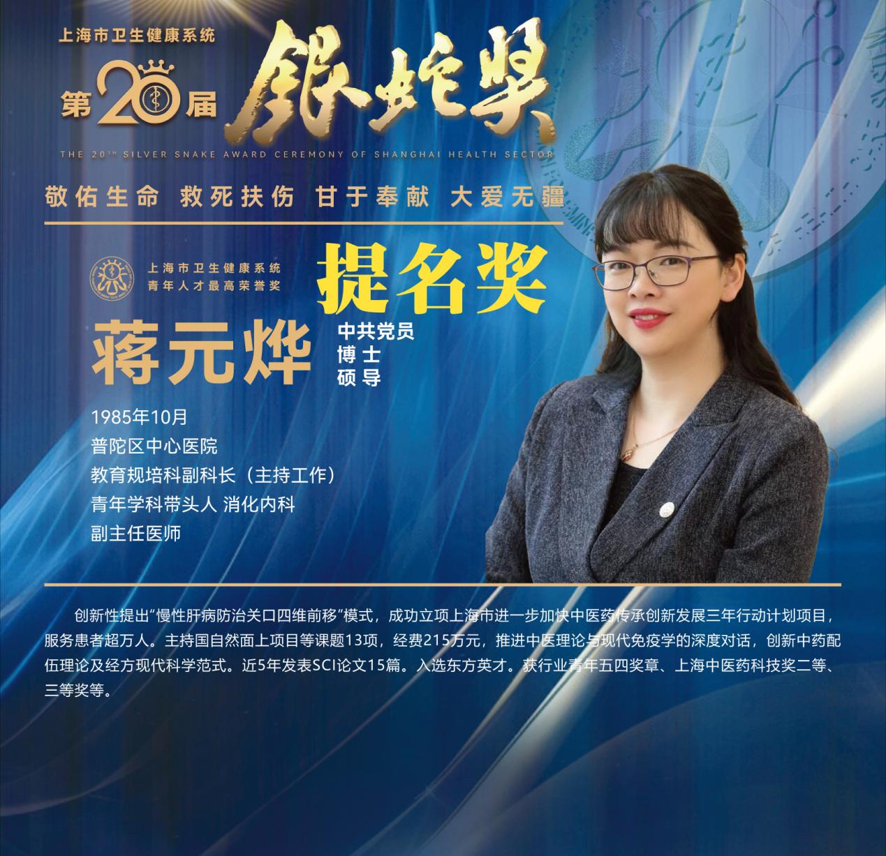 蒋元烨,女,医学博士,副主任医师,研究生导师,普陀区中心医院教育规培科副科长(主持工作)。先后入选上海市东方英才,上海市卫健委五四青年、普陀区区委首届拔尖人才、bat365中文官方网站十大医务菁英、后备卓越中医人才、青年杏林学者,普陀区杏林优青等人才。近年来主持包括国家自然科学基金面上项目、上海市自然科学基金面上项目等在内相关市局级以上课题15项,发表论文61篇(SCI15篇,Q1区8篇),并三次荣获上海中医药科技奖(分别为第一、第二、第二完成人)。