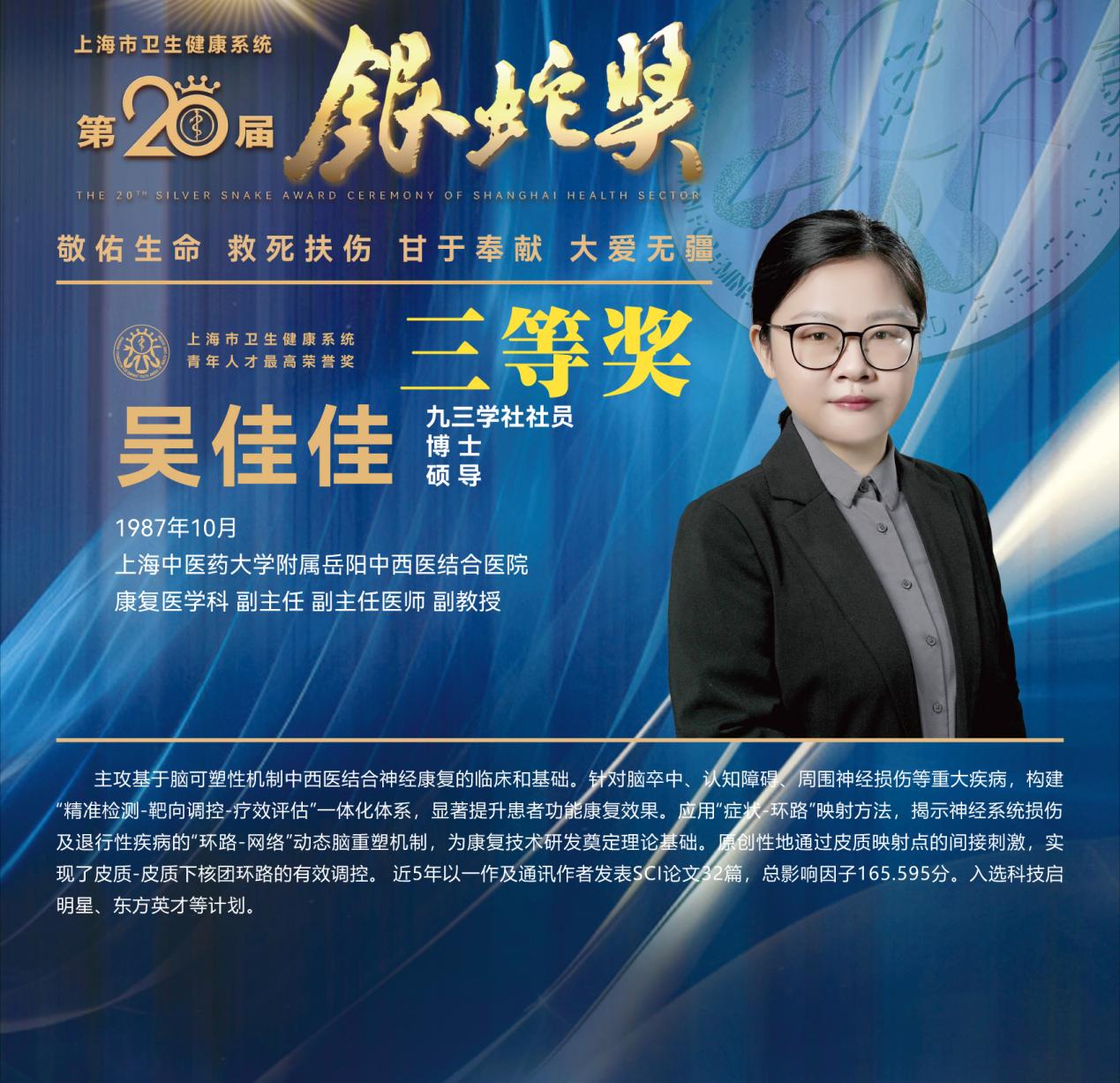 吴佳佳,女,博士研究生,副教授,副主任医师,硕士生导师,bat365中文官方网站附属岳阳中西医结合医院康复医学科副主任。主要从事中西医神经康复临床及脑可塑性机制研究。兼任上海中西医结合学会康复专委会常务委员、上海市医师协会医学机器人专委会康复机器人学组组长、中国康复医学会脑机接口与康复专委会委员、中国康复医学会脑功能检测与调控康复专委会青年工作组委员。入选上海市青年科技启明星、上海市东方英才(青年项目)。